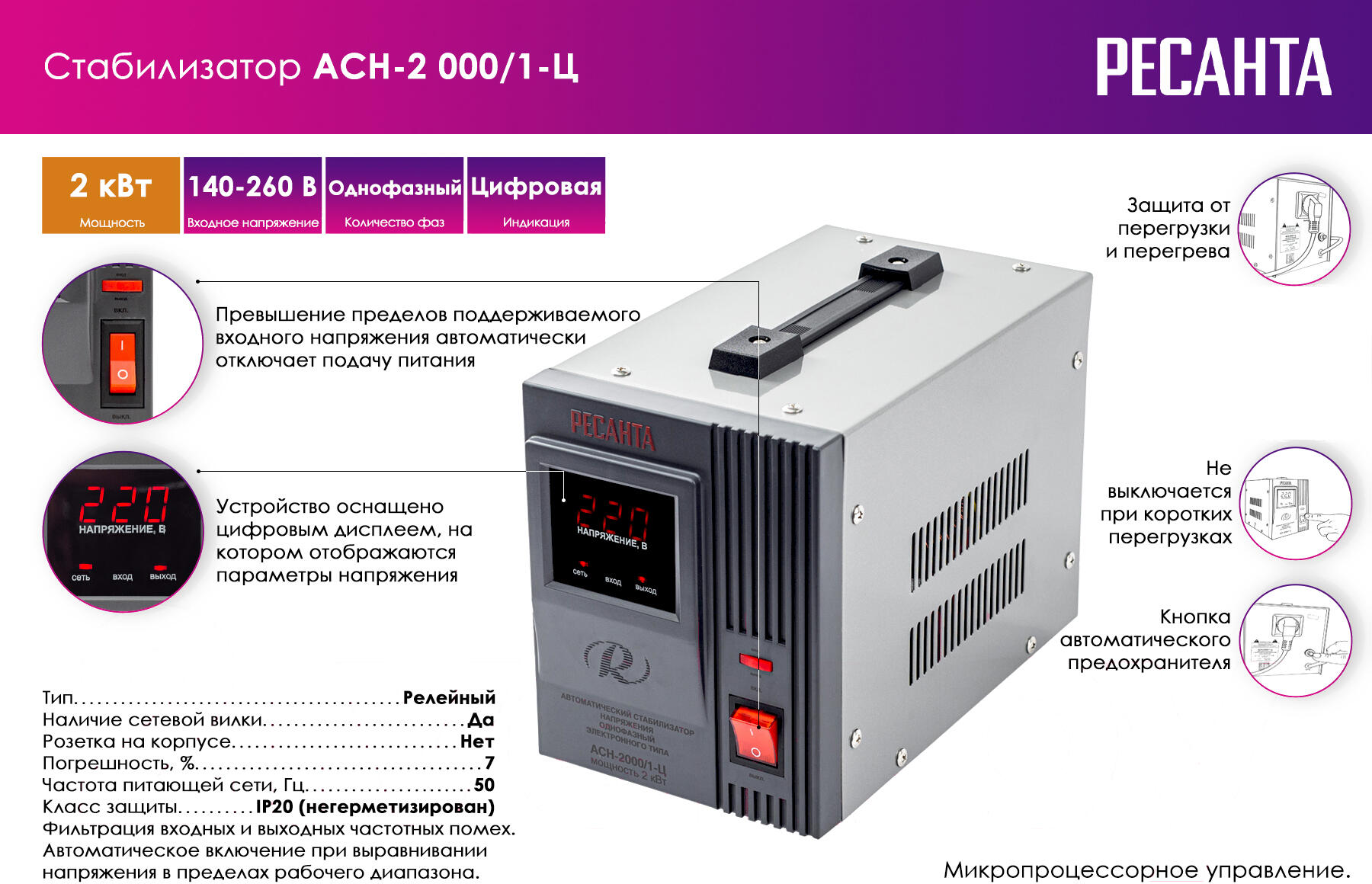 —Стабилизаторы, сетевые фильтры, удлинители Ресанта АСН-2000/1-Ц [63/6/4]
