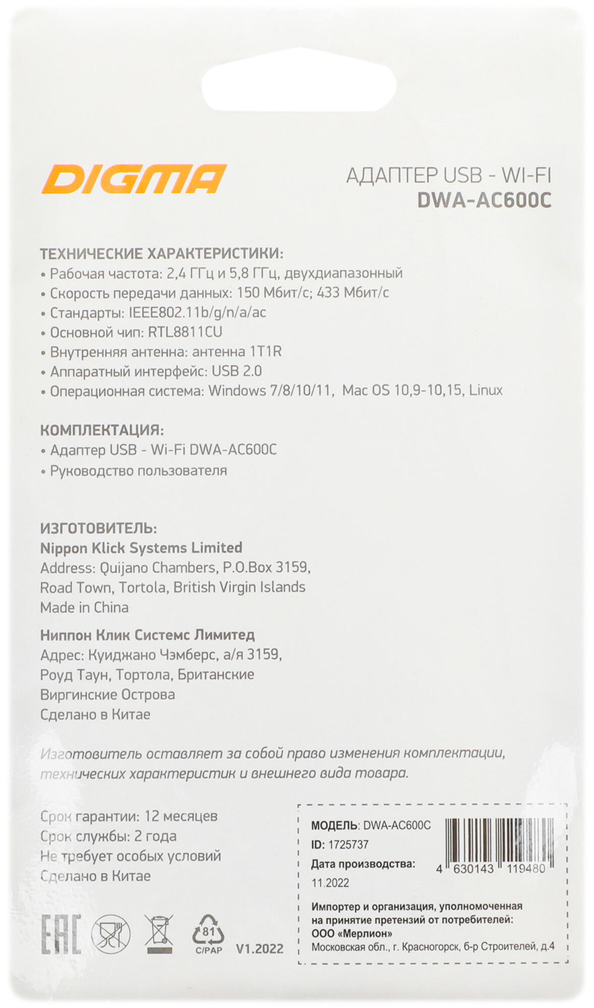 —Беспроводные адаптеры Digma DWA-AC600C [1725737]