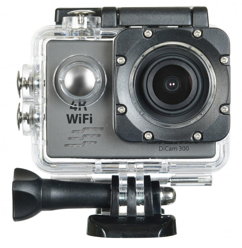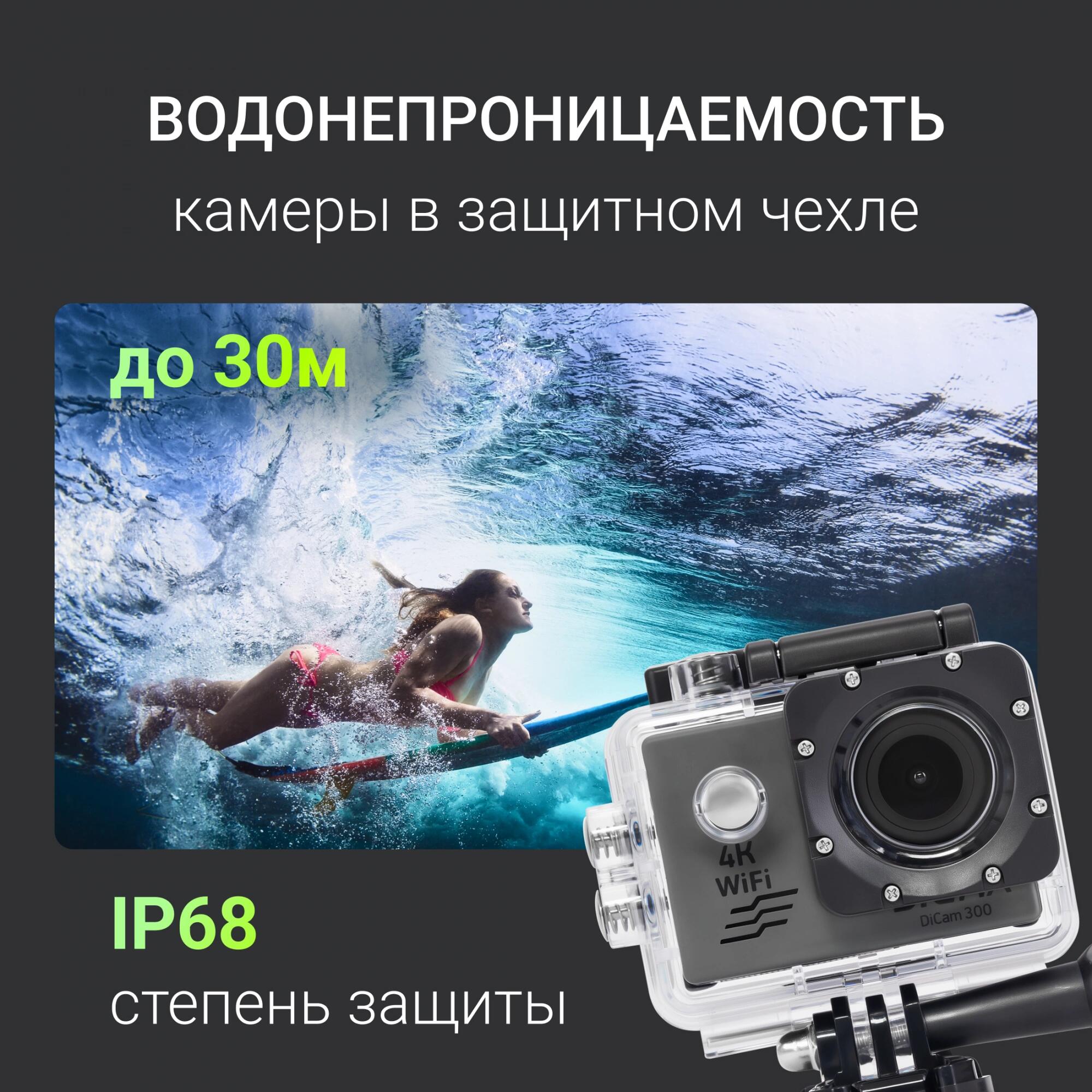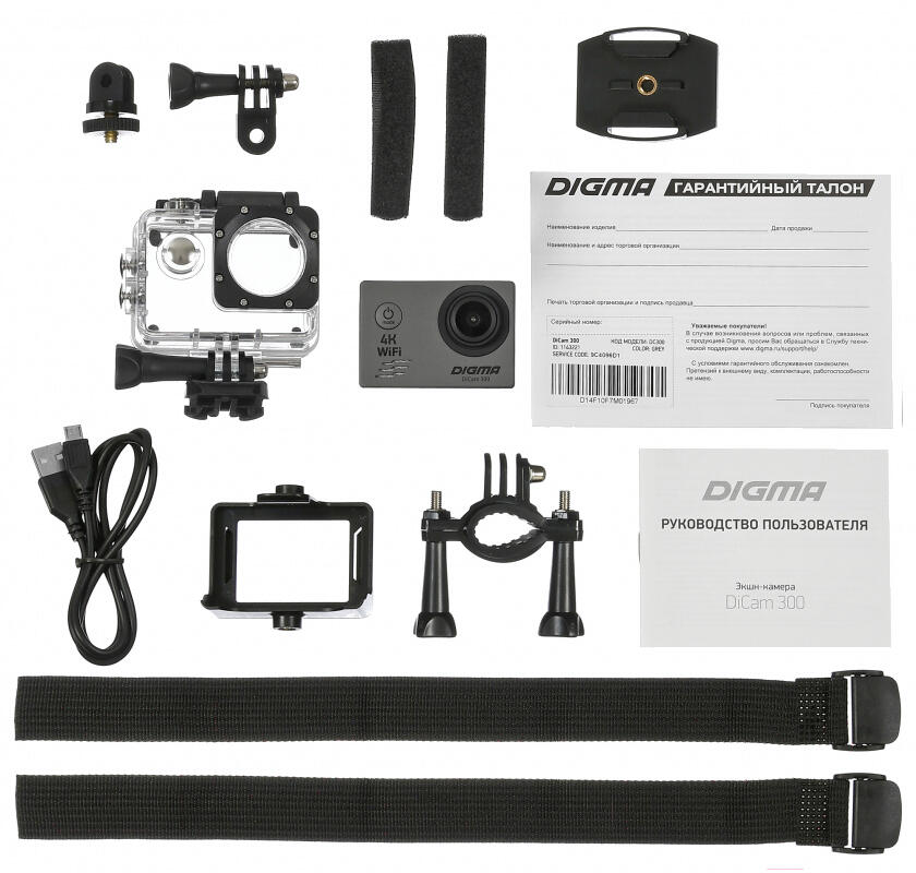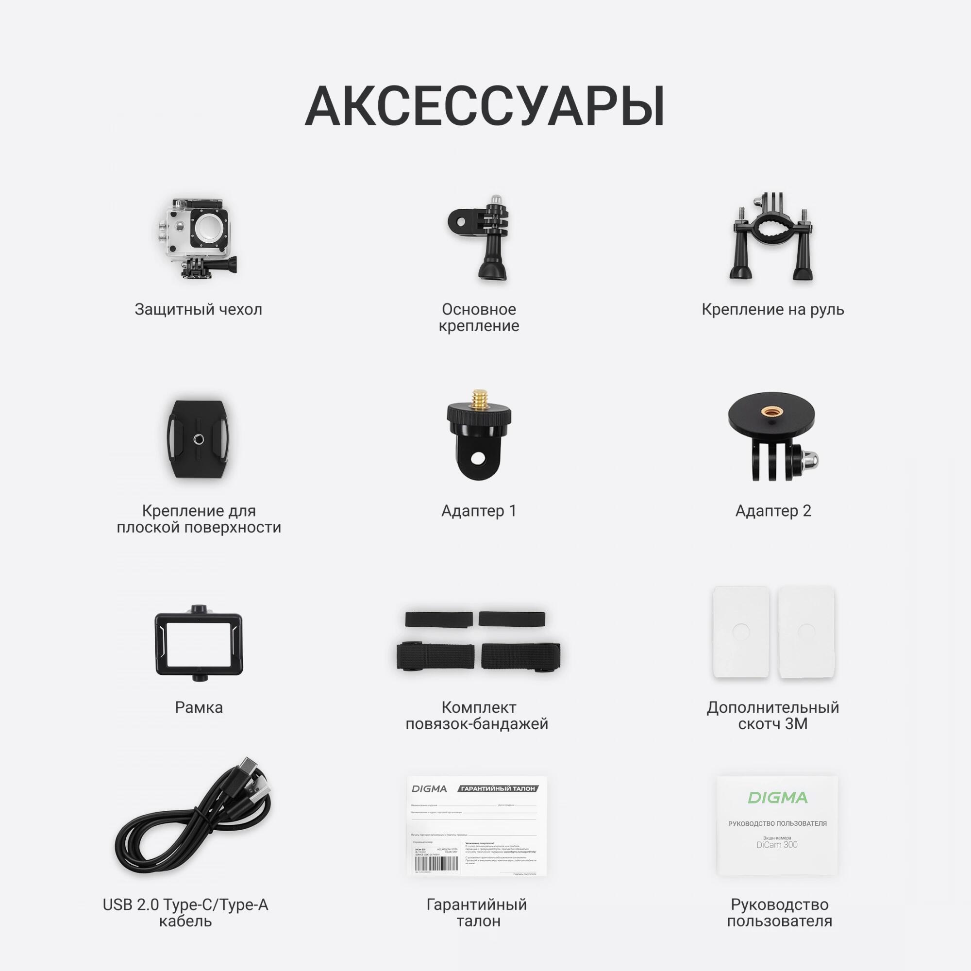 - Экшн-камера DiCam 300- Водонепроницаемый бокс- Основное крепление- Крепление на руль велосипеда- Крепление на шлем- Адаптер-переходник- Адаптер на резьбу- Рамка- Повязка-бандаж- Батарея- USB-кабель- Руководство пользователя